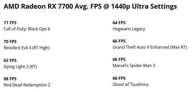 AMD cũng công bố các chỉ số FPS trung bình của RX 7700 khi chạy game ở độ phân giải 1440p với thiết lập cao nhất: