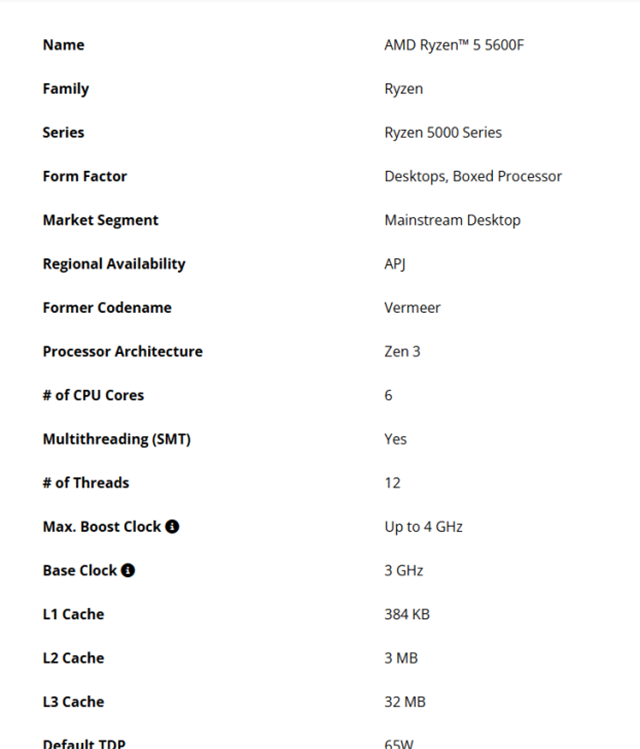 Bộ xử lý Ryzen 5 5600F mang đến một lựa chọn mới cho những người không cần iGPU, với cấu hình 6 nhân và 12 luồng, nhưng tốc độ xung nhịp thấp hơn so với phiên bản Ryzen 5 5600. Cụ thể, xung nhịp cơ bản của Ryzen 5 5600F chỉ đạt 3,5 GHz/4,4 GHz trên Ryzen 5 5600.