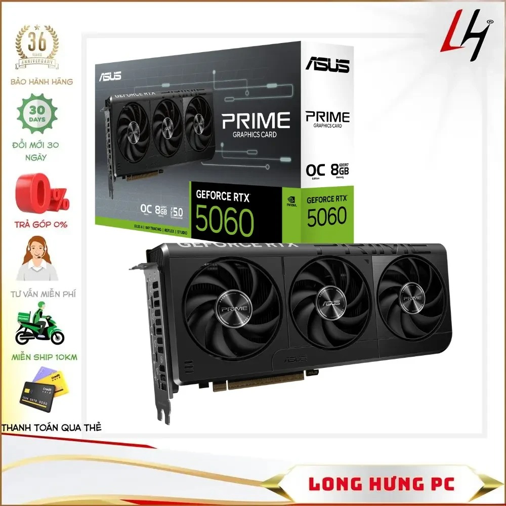 Asus Prime RTX 5060 8GB GDDR7 OC là card đồ họa tầm trung mới nhất của Asus, trang bị 8GB GDDR7 tốc độ cao, hỗ trợ PCIe 5.0, cùng xung boost lên đến 2.595MHz cho hiệu năng vượt trội. Với 3 quạt Axial-tech, tản nhiệt tối ưu và độ bền PRIME đặc trưng, VGA này đáp ứng tốt nhu cầu gaming Full HD - 2K, hỗ trợ Ray Tracing, DLSS, và kết nối hiện đại HDMI 2.1b & DP 2.1b. Đây là lựa chọn lý tưởng cho game thủ muốn một cấu hình mạnh, ổn định, giá hợp lý.